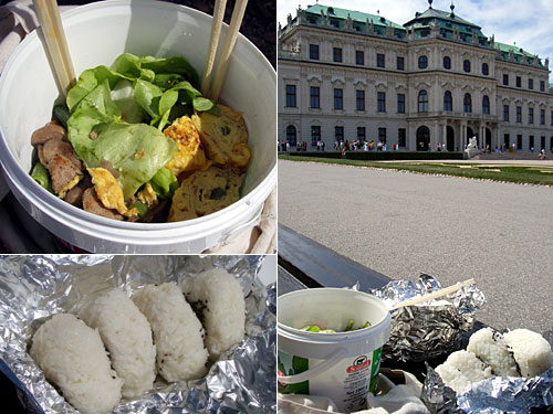夏の離宮でピクニック。左手の上宮から右手の下宮に向かって下っていくバロック様式の庭園が美しいことで知られているらしい。ベンチで「そんなにいいかなぁこの庭園」とか言いながらお弁当を広げる。庭園はともかく、木陰のベンチで宮殿を見ながらのお弁当はおいしい。スペイン人が通りがかりに「ブエン・プロベッチョ」(食事を楽しんでね!)と声をかけてくる。観光名所ならではだ。