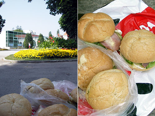 ウィーンから25km離れたバーデンという町にやってきた。目的は「温泉」。小さな町でベートーベンの住んだ家と旧市街の通りを見たら、もう見所は終了という感じ。目的の温泉の前庭でお弁当を広げた。レタス、ベーコン、カマンベールチーズ、ピクルスにマヨネーズあるいはマスタードをつけてみた。これはパリのバゲットでよくある組合せでピクルスとカマンベールチーズの風味がとても気に入っている。