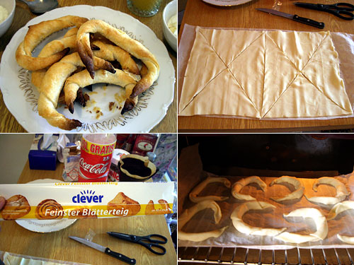 スーパーでパン生地はEUR0.66。これで朝パンを焼いてみることにした。適当に三角形に切って、くるくるっとまるめてオーブンに放り込んだ。まず、三角形はもっともっと二等辺三角形の二等辺を長くしないとだめ。先っぽばかりが黒焦げになっちゃった。その2としては、卵くらい塗ってみよう。全く照りというものがなく、寂しい。ま、あまりに気を抜いて作った結果だった。まずくなない。