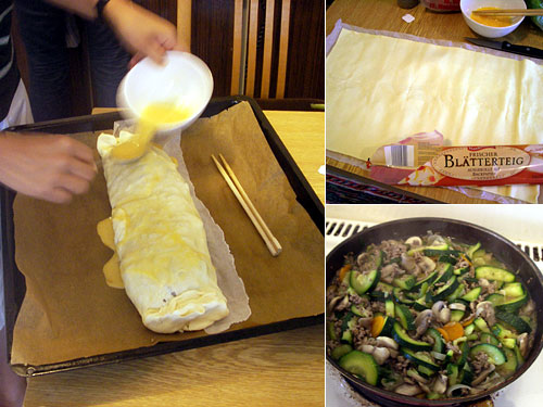 オーストリア人の友人宅でごちそうになったシュトゥルーデル、私も作ってみよう。お勧めのホッファーというスーパーで生地を買ってくる。これに、にんにく・唐辛子で香りをつけた油でひき肉、玉ねぎ、人参、ズッキーニ、マッシュールームを炒めて塩コショウしたものを載せ、グルグルっと巻く。オーブンペーパーに移したら、溶き卵を塗り、250度で20分焼き上げたらできあがりのはず。卵は1個全部使ってしまった。