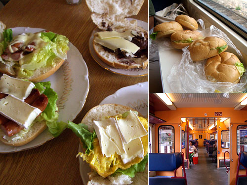 ウィーン郊外にある地底湖ゼーグロッテSee Grotteに行くピクニック。郊外への電車は広々して、各座席は向かい合わせでテーブルもついているので、ランチにはぴったり。パンはオーストリアの代表的パン、カイザーゼンメル、チーズはフランス産のブリー、アツアツの卵焼きやソーセージの上に乗せておいたら、溶けていい感じになっていた。サンドイッチ5つで材料費EUR2なり。安い!