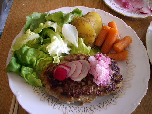ここじゃぁ大根は売っているが高いし量も多い。ということで、旬の野菜のラディッシュを大根代わりに使えないかと思い、半分をスライス、半分を卸しにしてみた。問題なしにおいしかった。ハンバーグには地元のパン、カイザーゼンメルの固くなったのをミルクでふやかして入れてある。ここでは硬いカイザーゼンメルにミルクと卵を入れて練り、スープで茹でるクヌーデルという料理が定番。肉なしハンバーグだね。