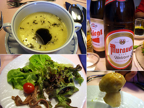 南瓜を茹でてつぶしてブイヨンと水を加えて作ったスープには南瓜の種のオイルとフライドガーリックをちらして見た目も美しくおいしいポタージュ。これまた庭で取れたレタスとトマトはアンチョビをつけてサラダに。ビールは地ビールMurauer。グラーツで人気のビールのようだ。話がきのこに及んだら、アンズ茸Eierschwammelをお酢とオイルにつけた保存食を出してくれた。こうして1年中楽しむのだそうだ。