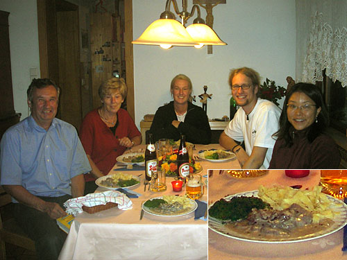 メインは友人のお兄さんの彼女が獲ってきた1年の小鹿のシチュー。ベシャメルソースに黒い粒胡椒が効いていて、肉は柔らかくて滋味に満ちた味わいだった。付け合せのパスタに絡めて最後までソースも楽しめる。ブロッコリーもお庭から。緑が濃くて味も濃い。オーストリアで狩猟の資格を取るには狩猟に足りる土地を持っていることが条件だそうだ。今日のメンバー左からお父さん、お母さん、友人2人、私。
