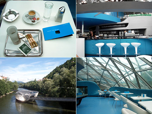 世界遺産都市グラーツの街中を走るムーア川には、人口の中州があり宇宙っぽい内装のカフェ&バーになっている。アメリカ人建築家のデザインだそうだが、周りの風景を壊すということで最初は建設反対の声があがっていたそうだ。しかし、今はすっかり街の名所。中に入ると水色と白の内装で音楽もクールにジャズ。川のせせらぎの中でお茶できるカッコいい空間になっている。新旧の文化が調和しながら存在しているのは面白い。