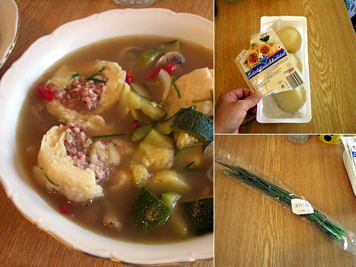 お手軽クヌーデルの別の種類を試す。今日はお団子部分にジャガイモが入っている生地で、中に玉ねぎとベーコンの塩味炒めの具が入っているクヌーデルだった。たしかドイツでクヌーデルというと、じゃがいもの粉を練ってパスタ状にしたものを指していたと思うので、今日のはドイツ版クヌーデルに近い。パンよりも生地がもちもちしているのが特徴。「あさつき」が旬に入ったらしくこれも入れた。スープが黒いのはマッシュルームの色。