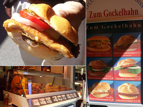 「鶏肉屋の前にチキンシュニッツェルサンドの写真が出ていたら試してみてくださいよ」と人から言われていた。シュニッツェルは通常豚肉で作るが、鶏肉バージョンもおいしいというのだ。ナッシュマルクトという市場を散策していると、ふとおいしそうな看板が目に入る。朝ご飯と昼ご飯の間の時間だけど食べてみるか。残念ながらここのは揚げたてじゃないけどなかなか美味。本当はあちちと食べるのがいいらしい。