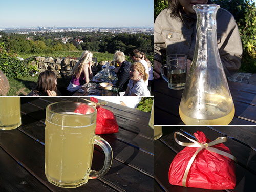 初ホイリゲに失敗したスケッチにいたく同情してくれた友人が、地元の人に人気のホイリゲに連れて行ってくれることになった。リベンジだ。グリンツィングから徒歩15分ほどの丘の上にあるホイリゲの庭園からはウィーンの町並みが一望できる。いい所だ。まずは乾杯にシュトゥルム。ブドウ収穫期限定のどぶろく。アルコール度が低くついつい飲みすぎて酔っ払うことから「嵐」という名が。友人からはプレゼントも。
