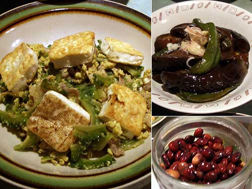 母が沖縄旅行で料理屋の気さくな女将から教わったゴーヤの炒め物。ゴーヤの中綿を取り2mmくらいの薄切りに。島豆腐の代わりに焼き豆腐の水分を抜いて焼く。ゴーヤを炒め、豚肉を入れて豆腐を入れて炒め、醤油で味付け。最後に溶き卵をかけ回して、火が通ったらできあがり。他にピーマンとナスをいためて醤油で味付けした煮物と酢豆。煎った豆の荒熱を取ったら酢に漬けるだけ。