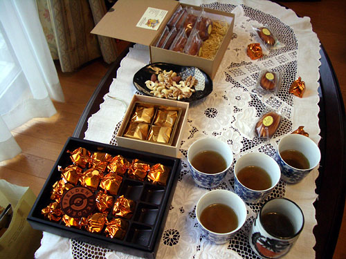 デザートは千鳥屋のチョコレート、マロングラッセ、アン・プチ・パケのマドレーヌなど皆が持ってきてくれたお菓子とアルゼンチンのマテ茶。千鳥屋のチョコはディズニーランドのドナルドダックチョコとして人気。アン・プチ・パケは知る人ぞ知る名パティスリーらしい。知らないうちに皆オトナになっていくんだねぇと妙に感心。因みに家のマテ茶はオーストリア人の友人がアルゼンチンから持ち帰ったのをもらった物。