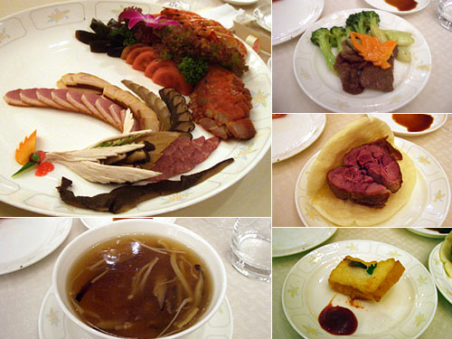 弟の結婚式披露宴のお料理は中華だった。うわーい!豪華、豪華。まずは鳳凰の飾り付けをした前菜。装飾もさることながらハム類おいしいねぇ。続いて干し貝柱とフカヒレのスープ、ブロッコリーと牛肉の炒め、合鴨の燻製ホイカツ添え。ホイカツってナンみたいなの。合鴨は全く臭みがなく柔らかいのに驚き。そして白身魚のトースト貼り揚げ。これもおいしかった。ちょっと考えても作るのはかなり面倒そうだ。