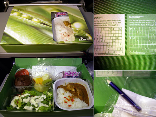 日本時間でいったら夜9時半、ヨーロッパ時間で午後2時半に夜食というか昼食。KLMではこの2回目の食事はパッケージに力を入れている。グリーンピースの写真が全面に印刷されたフレッシュな箱を開くと、中にはカレー。機内で疲れた体に目に優しく、スパイスで食欲の出るカレーという組合せはとてもいい。しかも箱の裏にはSUDOKU付き。ヨーロッパで大流行の日本発ゲームで、鉛筆までついていた。
