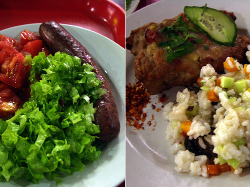 私はメインにソーセージとサラダ、夫はキョフテとピラフ。ソーセージは細かく挽いた肉でスパイスの効いたチョリソー風で少しブヨブヨしているタイプ。最後まで食べられず夫に献上した。キョフテはスパイスの効いたハンバーグで、ブルガリアの郷土料理だ。屋台などでは炭火の上のバーになった鉄板で焼くのでバーの焼き跡がつくのが特徴だが、ここのは全体に焼けていた。ピラフは野菜がたっぷり入っているもので、あっさりし味。