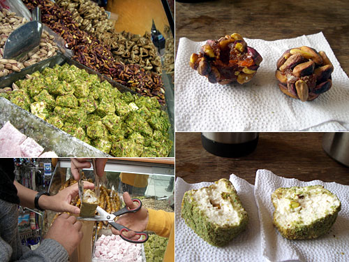 トルコの菓子はライスプディングやシュークリームのチョコレートがけなど、カフェで扱う生菓子風のものと、日持ちする干菓子風のものがある。干菓子風のものは、人参を材料にしたオレンジ色のもちもちした物に、白いココナッツをまぶした物が一般的だが、今日買ったののはピーナッツをまぶしたもの。もう一つは固めのマシュマロというか柔らかめのヌガーみたいなロクロという名の菓子。グリーンのピスタチオがきれい。どちらも素朴な味。