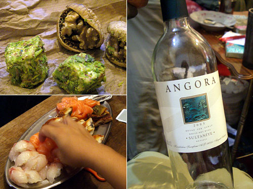 早めの夕食後小腹が減り、トルコ菓子の続きを。マシュマロ風にピスタチオをまぶしたのと、干しいちじくに胡桃をはさんだの。胡桃のが大ヒット。そうこうするうち、市内で寿司職人として活躍している方が、ワインと寿司を持参で遊びにきてくれた。うぁおー、素晴らしい。鯛、サーモン、鰻。店では何と2巻でTRY6〜9もする(店はもっとネタが大きいそうだが)。日本からの空輸をヨーロッパから輸入しているそうだ。
