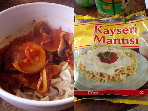 小麦粉の薄い皮でひき肉の具を包んだトルコ版餃子というかラビオリ。冷凍食品としてスーパーで買ったのは、とても小さなもので、Mantisiと書かれていた。ちっちゃいマントゥという意味かもしれない。本来はにんにく入りヨーグルトをかけて食べるようだが、私たちは野菜入りトマトソースで食べた。小さくとも中の具がとてもスパイシーで、胡椒とクローブとナツメッグを強く感じた。スパゲッティーにはない面白さがある。