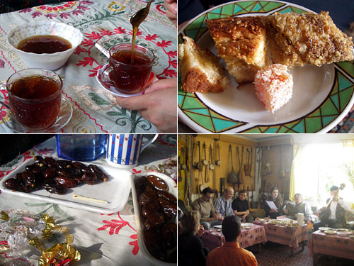 先日CDを買った楽器店は音楽の大学教授の店だった。ラマダン明けを祝う内輪のお茶会にいらっしゃいといわれ、今日、店の4階に招かれると、チャイ(紅茶)にはちみつや砂糖を入れたものとナツメヤシや焼き菓子などのトルコ菓子を振舞われた。焼き菓子はサブレよりはしっとりとした甘い味。またパイ生地を重ねて上にゴマを降り、蜂蜜漬にした菓子もあった。上質の音楽と共に祝うトルコのお茶会はとても贅沢だった。