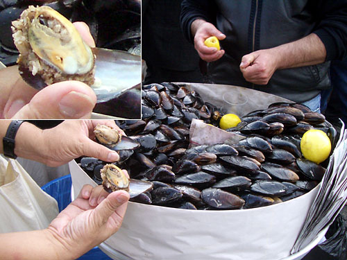 ムール貝の第一スナックはミディエ・ドルマ。ドルマは「詰め物」料理で、直訳は「ムール貝詰め」ってことになる。ムール貝の剥き身がピラウの上に鮨だねよろしく乗っかったのが、貝殻の中に入っていて、値段も安くて3つでTRY1(=US$0.68、\81)。注文すると、その場で1個開けてレモンをかけて渡してくれる。食べ終わると2個目。と、椀子そばみたいで楽しい。胡椒の効いたピラウと海の香りの貝。潮風に吹かれて食べるから尚おいしい。