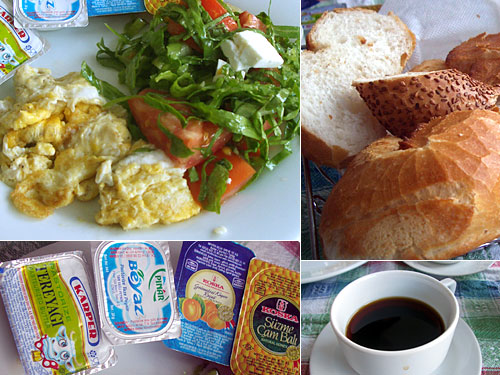 Kale Otelのドミトリー宿泊者は朝食なしなので、別途注文。卵はスクランブルエッグ、ゆで卵、目玉焼きから選べるし、ジャム、チーズ、マーガリン、ハニーなどパンにつけるパッケージも色々な種類が出てきて面白い。パンは周りがカリっとして中が柔らかいエキメッキとゴマのついたシミット。どちらもトルコの代表的なパンだ。朝買ってきてくれるので、これもおいしい。コーヒーだけはこだわりのある夫が自分で入れたもの。