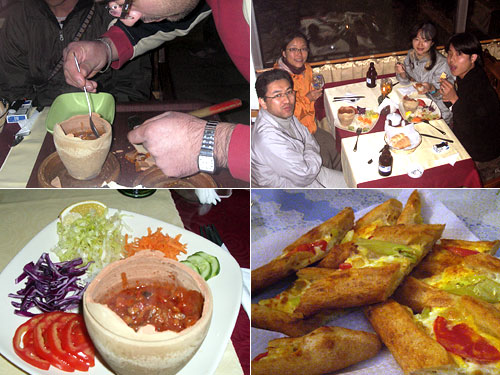 世界一周でハネムーンをするあきら&めぐみ夫妻に再会。この地方の料理テスティ・ケバブを食べに行くというので便乗した。壺に入った料理は目の前で店の人が割ってくれる。あらかたのかけらを救い出してサーブ。トマト・じゃがいも・肉・玉ねぎのスパイシートマト煮。パプリカなのかピリっと辛い。二人で1人前ではちょっと物足らず、近所のピザ屋へ。ここのピデは非常に旨い。