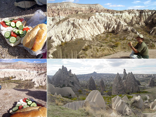 カッパドキア2日目は10キロ程のトレッキング。歩き始めて2時間で丁度ローズ・バレーを目の前にした丘に到着。薄いピンクに染まった断層を見ながら、スクランブルエッグとキュウリとトマトのサンドイッチを作ってぱくつく。左手にはカッパドキア特有の奇妙な巨石がゴロゴロ。目に映る光景が乾いているせいか、キュウリとトマトがやたらに旨い。辺りに人はおらず、私たちだけのカッパドキアを満喫できた昼食。