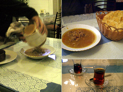 先日来た時になかったテスティ・ケバブがあるというので、それも注文。この地方の郷土料理で素焼きの壺に肉や野菜を入れて釜で焼いたのもで、壺をコンコンと割って客の目の前でサーブしてくれるのが楽しみな料理。ここのテスティ・ケバブは先日食べたのと違ってサラサラとしたスープのようだった。肉の量は多かったが、他の野菜はやや少なし。同じ料理でも店によって随分違う。やはりこの店はピデってことで。