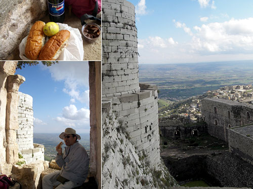 あまり何も考えずに朝ごはんの余りを持ってでかけたクラック・デ・シュバリエは宮崎駿男さんの天空の城のモデルになったという高台にある遺跡だった。実際にはトルコ系セルジューク帝国に対してヨーロッパがキリスト教の聖地エルサレムを奪還するために送った十字軍の城塞である。そのコマンドタワー、総司令官塔で昼食。飯の内容はともかく、眼下の平地までずっと見渡せるロケーションで景色はおいしかった。