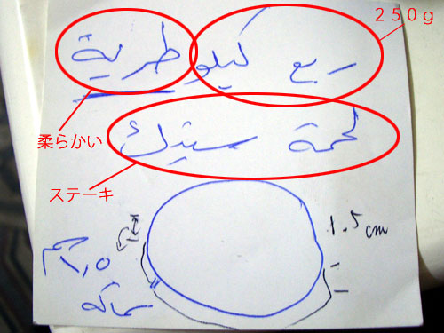 今日は昨日発見した牛肉のもも肉をステーキ用の切ってもらうことに挑戦。宿のスタッフに相談すると、それではここに肉屋を呼んで肉をお見せしましょうか?なとど言い出す。大富豪じゃないんだから、自分で肉屋に行きますよと、主要な単語をアラビア語にしてもらい簡単なメモを作成した。ぺローンと丸いハンバーガーみたいな絵も書いてくれたのだが、これが吉と出るか凶と出るか?