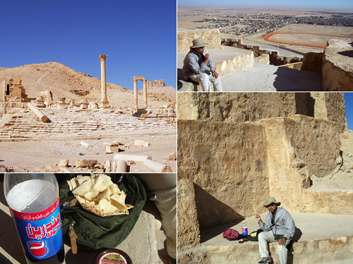 パルミラ神殿の遺跡の端に標高150mの丘があり、その上にアラブ城がそびえている。地面も遺跡も丘も城も皆同じ砂岩色。空と砂岩色の2色しかない風景のなかを徒歩でアラブ城まで登って、そこでお昼ご飯とした。取り出したのは、宿の朝食についてきたホブス。考えてみればホブスも砂岩色。目に入るもの口に入るもの、全てが共通して色のない世界にいるような気分にとらわれる。