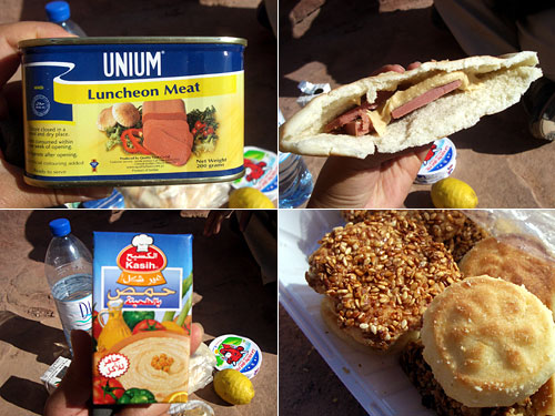ぺトラの拠点になるワディ・ムーサという村はとても小さな所。ハムは見つからずに缶詰のランチョンミートやコンビーフのみ。このランチョンミートは練り物っぽくて、あまりおいしくなかった。またパックに入ったホンモス(豆のペースト)はパンに塗ってハムとチーズのサンドイッチにしたが、ホンモスも質が悪い。救いはゴマとピスタチオのクッキー。これは旨い。