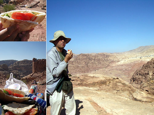 2日目の今日はメインストリートからはずれて、左右の丘に登るトレッキングコースをこなした。朝一番で右手の丘に登り、引き続き左手の丘(犠牲祭壇)に登った所で午前11時。色々見学して、ここで昼食を摂ることに。全部赤茶色の風景なので遠近感がわかりにくいが、とても遠くまで見える。こういう風景の中でのキュウリとトマトとチーズのサンドは瑞々しさが際立ってとても旨い。