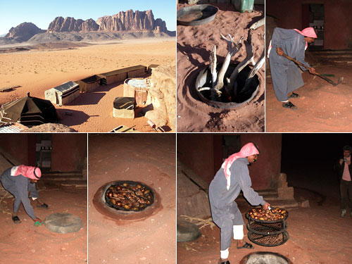 テントに到着するなりアリが地中の釜に薪を放り込んで火を燃やし始めた。炭になったところで、材料の籠を埋めてフタをして土をかぶせる。これがベドウィン式BBQなのだそうだ。夕食まで2時間半くらいゆっくりと蒸し焼きにされたBBQ。辺りを通る度に香ばしい香りがして、おお、ここに埋まっているんだと楽しみになった。夕食時、いよいよ掘り出し作業。
