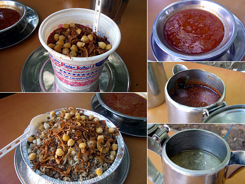 ダハブEGP2づつ高めの小(4)中(5)大(7)という価格設定。EGP1は20円である。他の店と比べたらこんな差はないに等しい。コシャリと共にトマトスープみたいなのが出された。テーブルには物凄く辛いチリソースと香草の入ったレモンソースのポットが置いてあり、これらのソースで好きに味付けできる。米とマカロニとスパゲッティーミックスにフライドオニオンとヒヨコ豆は定番だ。レモンソースがとてもおいしかった。