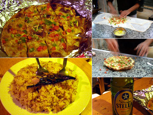 献立:ピザマルガリータ、ビール、宿のスタッフのまかない飯