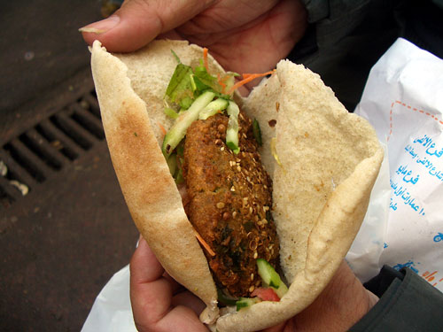 カイロに到着して宿の周りを散策した結果、この店が常に混んで人気のファラフェル屋であることを発見。ファラフェルは緑色のソラマメのミンチにけしの実やスパイスを入れたコロッケだ。シリア、ヨルダンにもファラフェルはあったが揚げ油が悪いし、とてもおいしいとは思えなかった。しかし、エジプトのファラフェルは全く違う。旨い。旨い。そして特にこの店は回転がいいので揚げたての温かいファラフェルときている。安い、早い、旨い!!