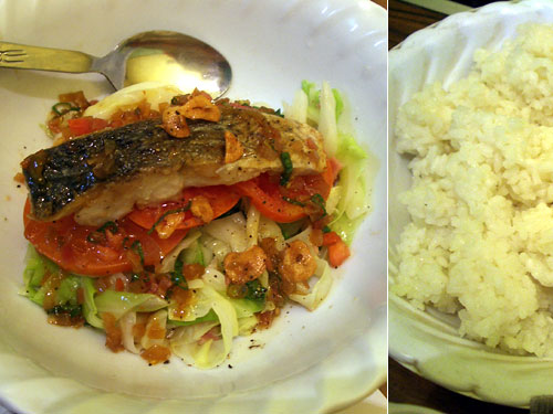 献立:イシモチのソテー、焼きトマトとキャベツのビネガーソース