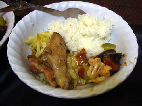 献立:鶏のコンフィ、ピューレ・デ・ポテト、茹でキャベツサラダ、タラトゥーユ風野菜の煮物、ご飯、年越し天婦羅そば