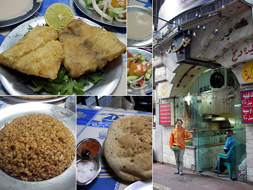 宿の近くに気取らない食堂が並んだ通りがある。この中の1軒に魚の唐揚定食を出す店があるというので行ってみた。狭い店内は2階が客席でテーブル2席のみ。唐揚は白身魚の切り身が2つで、冷凍臭くもないし、敷いてある香草とレモンで更においしくなる。魚介類に定番の茶色い炊き込みご飯のスパイスも魚に合う。これにアエーシ(パン)とタヒーナ(ゴマソース)とサラダで一人150円くらいなので嬉しさに涙が出る。いい町だなぁ。