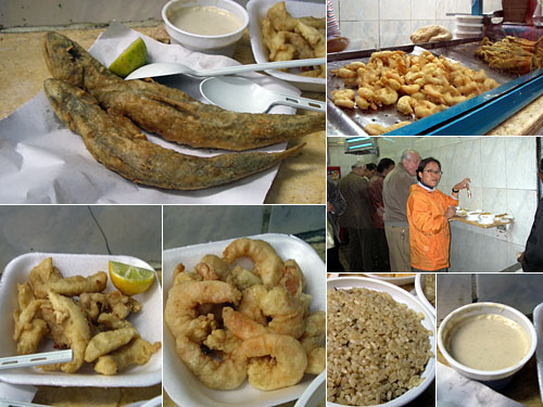 宿の近くに天婦羅屋がある。揚げ物続きだけど、行ってしまえ。カウンターにある2種の魚、エビ、イカ混合で1kgあたりEGP36(約720円)。250g注文したら結構な量になった。魚は柔らかい白身の魚で、エビもイカもなかなかおいしい。元来フリッターなのだが、衣が薄いので家庭の天婦羅に近い。炊き込みご飯のスパイスは先日よりも薄め。立食いカウンターで。