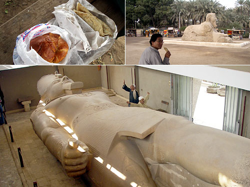 遺跡博物館にある巨大なラムセス2世の彫刻を見に、地下鉄とミニバス3つを乗り継いではるばるメンフィスにやってきた。かつての都は見る影もなく、遺跡は何も跡を留めていない。こんなに苦労して来たのに見所はこのラムセス君だけなのだ。しかし、苦労があるからこそ、これだけ見ても楽しめるってもんさ。宿の近所のパン屋の大きなクロワッサンはバターが効いてなかなか旨い。保存のいいスフィンクス前で。