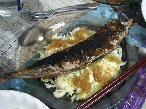 献立:アジの炭焼き、茹でキャベツ、ご飯