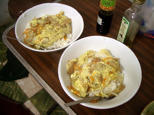 昨晩の天ぷらでなすが余っていたので、これをカツに見立てて丼物を作った。水にスライスした玉葱と人参を入れて煮立てて、かつおだしと砂糖と醤油を加えて煮る。ここになすの天ぷらを入れて、温まったら、溶き卵を3分の2入れてぐるぐると箸でかきまわして凝固させる。最後に溶き卵の残り3分の1を上から回しかけて半熟になったら火を止めて蓋をして完全に火を通す。半熟がいいのだがカイロでは生卵は問題があるらしい。うん、美味。