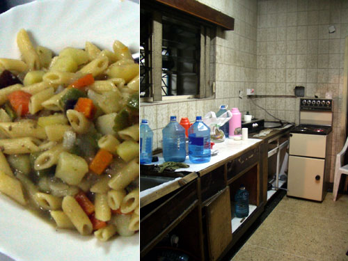 宿泊はサファリツアーを催行している会社の一角のドミトリー。ということで、宿泊所として十分な水が供給されずに夜は大抵断水状態になる。加えて従業員用のキッチンはコンロが2つしか使えない上、電気なために火力が弱い。自炊時間は速やかにしないと他の人に迷惑がかかる。なので野菜とブイヨンとペンネを一つの鍋にぶち込んでとにかく煮る。できあがりはともかく、日没後に外食に出るよりはよっぽども安全という調味料付きだ。