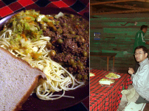 シャワーを浴びて夕食が始まったのは午後8時半だった。キャンプテントに照明はないが、食堂の建物だけは照明を灯してくれる。ほんの僅かな時間なのに、照明のない生活の不便さを感じてしまう。昼もそうだったが、野菜がたっぷりと用意されているのがありがたいメニューだ。スパゲッティーでも食パンがついてくる所がイギリス統治の国をうかがわせる。テーブルクロスはマサイ族が身にまとっている布だ。