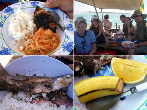午後1時半、船に戻ってお昼開始。炭焼きされたキングフィッシュは身がぷっりぷりで、先日ラム島内のレストランで食べた物とは比べ物にならないほど新鮮でおいしかった。それに比べるとレッドスナッパーは身にしまりがなく、ここではキングフィッシュの方が人気なのがうなずける。ココナッツご飯はあまりココナッツ臭がなくとても食べやすく、トマトベースの野菜煮物もたっぷり。バナナとオレンジのデザートで満腹。