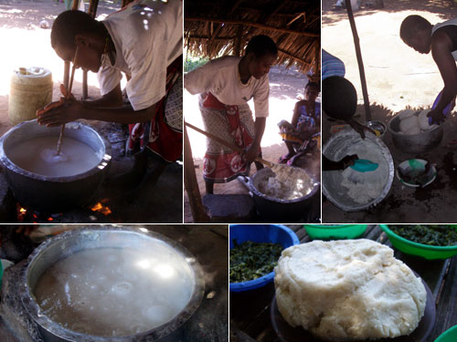 ナイロビで知り合った俵さんの紹介でワタムから程近いゲデという所にあるムゼー・ランドゥー酋長さん村を訪ね、ゴマという太鼓演奏と民族舞踊を見せてもらった。お昼ご飯も食べていってと誘われるまま、まずはウガリ作りの見学。水ととうもろこしの粉を棒でかき混ぜながら熱し、ポタポタとしてきたら更に粉を加えてヘラで練り上げる。餅状になったものを皿にすくって丸めてできあがり。