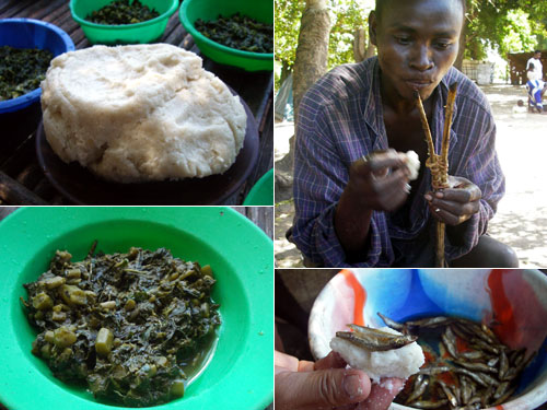 熱々のウガリは右手でちぎって丸める。この時、中央に窪みを作っておいて、この窪みをスプーン代わりにおかずをすくって食べるのだと教わりながら、初めてのウガリ。できたてはもちもちしておいしい。他にも小魚を水でもどしたものや、鶏の腸を2本の枝にぐるぐる巻きにして炭焼きにしたおかずもでてきた。おいしいねぇ。ウガリと小魚で寿司の説明をしたがあまり受けなかったなぁ。
