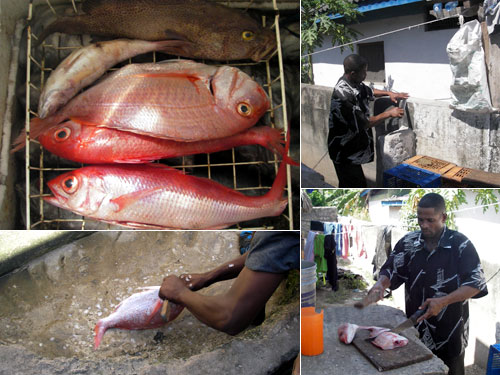 折角、新鮮な魚が買える所にいるのだからと、最後の夜もレッドスナッパーを食べることにした。昼過ぎに前回買ったお店に行くと、私たちを覚えていてくれた御主人が冷蔵庫を開けて見せてくれた。500gの次は1.4キロのものになる。悩んだが1.4キロを貰うことにした。今回は忘れずに鱗を取ってもらい、頭から4切れにぶつ切りにしてもらった。コンクリートの塀で包丁を研いで、包丁を棍棒でたたいてぶつ切り。