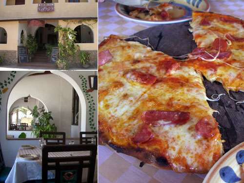 旅先で出会った人から旨かったと教えてもらって訪ねたピッツェリアは、白い壁がアラビックにくり貫かれた装飾でケニアの東海岸的なシックな内装が洒落ていた。12時少し前に店に入ると、ジュースはまだ凍っているし、釜もまだ温まっていないということで30分ほど待たされたが、出てきたピザはたっぷりとモツァレラチーズが乗ったパリパリの薄い生地。周りの焦げ目も香ばしく、久しぶりに本当に旨いピザだった。