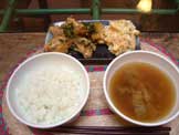 唐揚、ポテトサラダ、ご飯、味噌汁